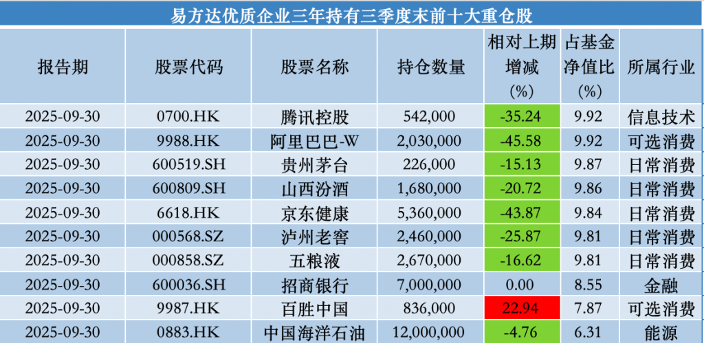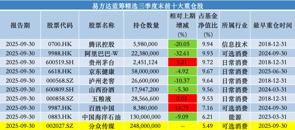 具体来看,易方达蓝筹精选期末前十大重仓股依次为:腾讯控股(00700.HK)、阿里巴巴(09988.HK)、贵州茅台(600519.SH)、京东健康(06618.HK)、泸州老窖(000568.SZ)、山西汾酒(600809.SH)、五粮液(000858.SZ)、百胜中国(09987.HK)、中国海洋石油(00883.HK)、分众传媒(002027.SZ)。