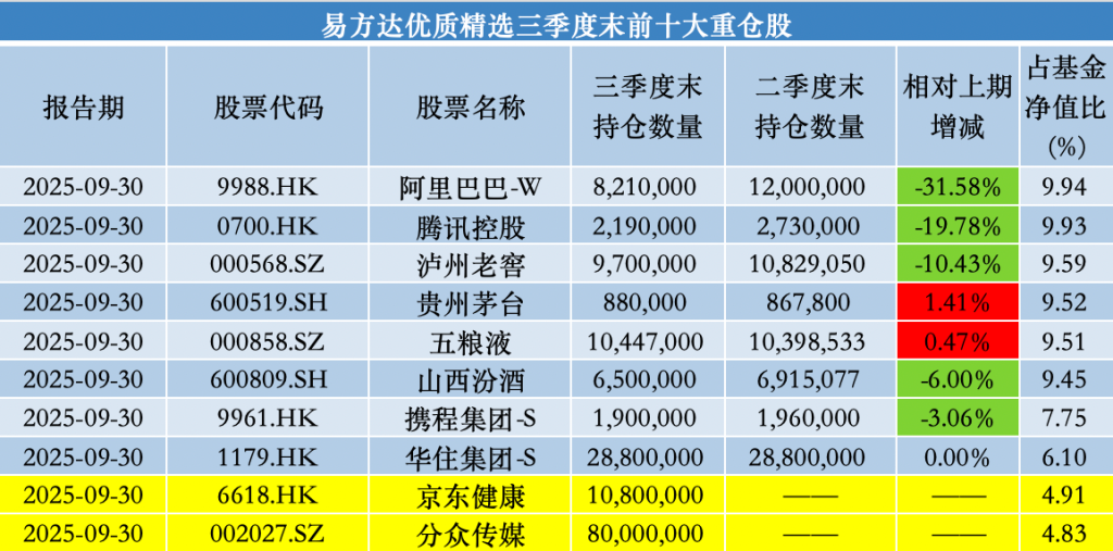 值得一提的是,京东健康与分众传媒在三季度期间新进易方达优质精选的持仓前十。其中,对比2025年中报披露的持仓数量,京东健康的持股数量并未被主动增减持,而分众传媒则获张坤增持2000万股,增持比例达33.33%。