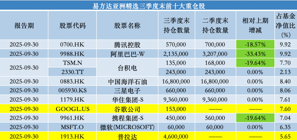 而普拉达(01913.HK)则重回易方达亚洲精选的持仓前十,但从持仓数量来看,反而还较二季度末减少了10万股;此外,谷歌首次进入该基金的前十大重仓股行列,持股数量为15.30万股。
