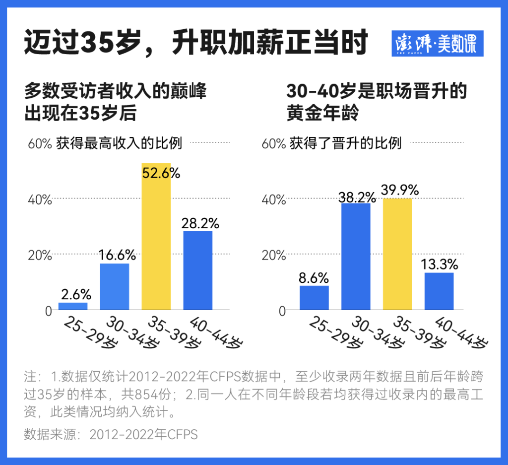 在澎湃美数课梳理的2012-2022年中国家庭追踪调查(CFPS)数据中,受访者到了35-39岁这个阶段,是他们获得最高收入、晋升机会的黄金时期。