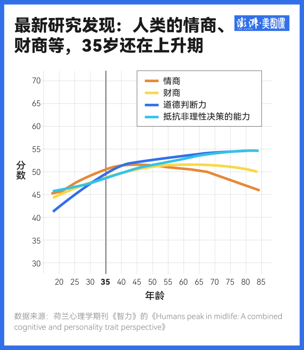 比如,情商最高的时候大约在45岁;责任心和情绪稳定性在50多岁时最为突出;面对道德推理、对沉没成本偏差的抵抗力等复杂问题的处理能力,或许持续提高到70甚至80岁。