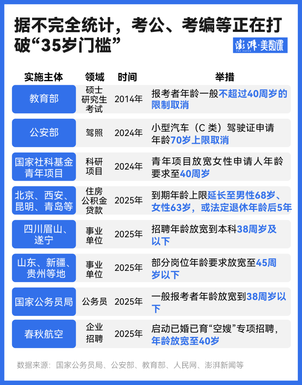 如四川眉山、遂宁2025年下半年招聘,本科38岁以下可报考部分事业单位;40岁以下可申请国家社科基金青年项目;就连70岁以上人群,只要通过记忆力、判断力、反应力测试且符合体检要求,也能申请驾照开车上路。