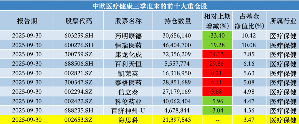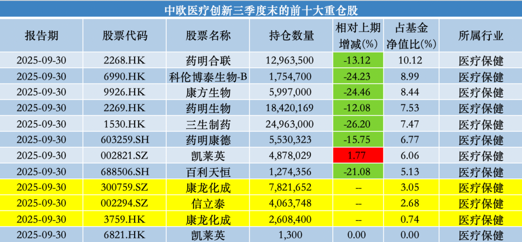 从前十大重仓股持仓情况来看,康龙化成AH股、信立泰首次新进中欧医疗创新的持仓前十。其中,葛兰于2025年上半年期间对康龙化成的持股数量为66.87万股,三季度期间又增持了71.53万股,加仓比例高达1069.76%。