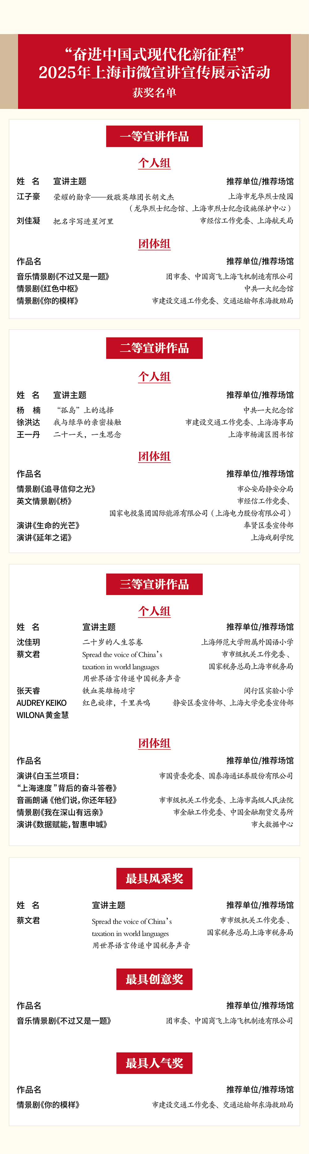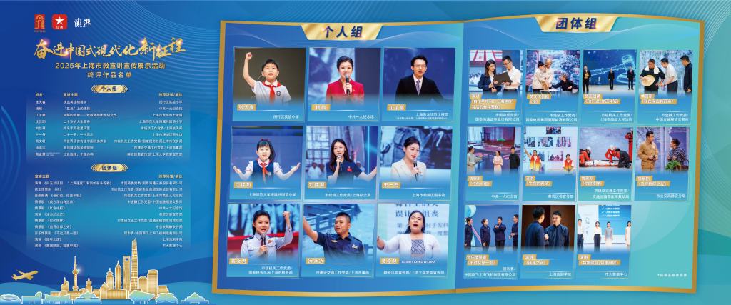 讲好新时代奋进故事,传递中国式现代化的上海声音。10月28日下午,“奋进中国式现代化新征程”2025年上海市微宣讲宣传展示活动终评在宛平剧院小剧场圆满落幕。来自全市各行各业的9位个人选手和11组团体选手同台竞技,经过专家评委现场评分与观众票选,活动各大奖项获奖名单出炉。