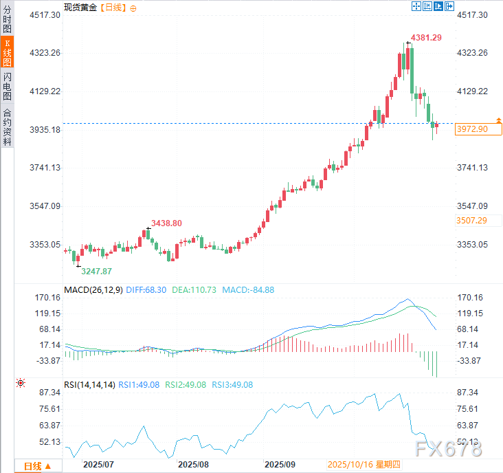 从技术面看,此轮下跌触发点十分明确。当上周4005美元低点告破后,密集止损单被触发,导致金价短时间内急速下挫。从该位置开始计算,金价已一度暴跌超100美元,周内最低达3886.51美元,目前暂在3900美元附近获得支撑。