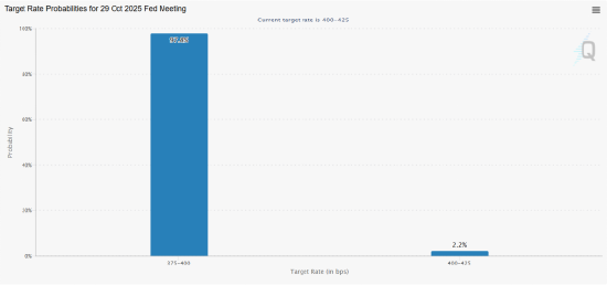 交易员和经济学家自信地预计美联储将降息至3.75-4.00%的区间。截至撰写本文时,CME FedWatch显示联邦基金期货交易员预计降息25个基点的可能性为98%: