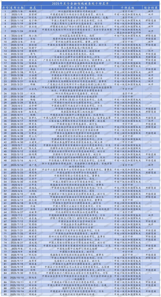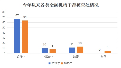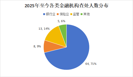 据统计,今年以来截至2025年10月27日,金融系统已有90名干部被查处,其中银行业占比71%,国有大行为“落马”重灾区。与此同时,监管系统被查处人数增至13人,同比增长18%,凸显“内鬼”清理力度同步加强。