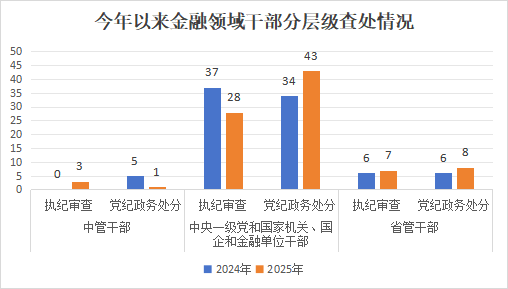 进一步来看,被查处的中央一级党和国家机关、国企和金融单位干部与去年同期人数相同,有43位已被执行党纪政务处分,较去年同期的多9人,增幅达26%。剩余28位干部目前处于执纪审查阶段,较去年同期少9人。
