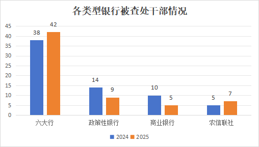 按照银行大类来看,国有行为干部“落马坡”。今年以来六大行共计42名干部被查处,在银行业被查处干部总数中合计占比66%,较去年同期增长4人。