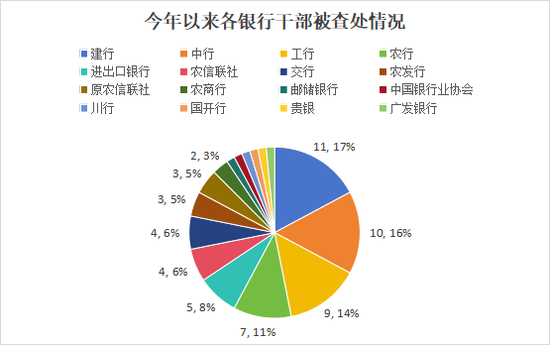 其中工行被查处干部最多;政策性银行9位干部被查处,较去年同期下降36%,减少5人,合计占比14%;剩余13位被查处的干部中,5人来自除国有行之外的各商业银行,7人来自农信社,1人来自中国银行业协会。