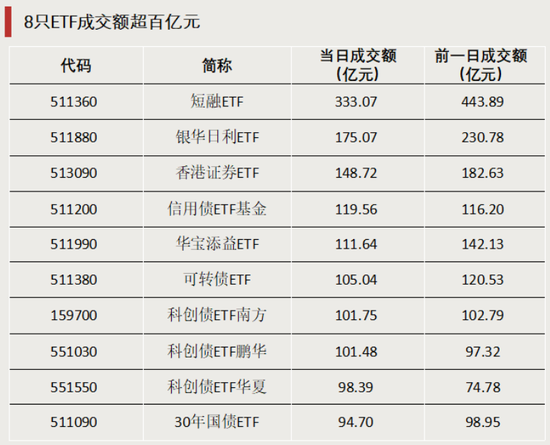 今天债券型ETF成交活跃,成交额排名靠前的ETF多是债券型ETF。短融ETF、香港证券ETF、信用债ETF基金等8只ETF成交额超百亿元,其中有7只ETF前一交易日成交额也超过百亿元。
