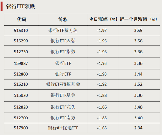 10月29日,跌幅居前十的ETF均是银行主题ETF,银行ETF易方达跌1.97%,银行ETF天弘、银行ETF指数等跌幅均超1.9%。
