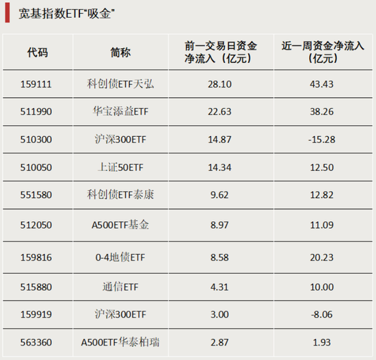 10月28日,沪深300ETF、上证50ETF、A500ETF基金等多只宽基指数ETF“吸金”,两只科创债ETF和通信ETF也有较多资金流入。