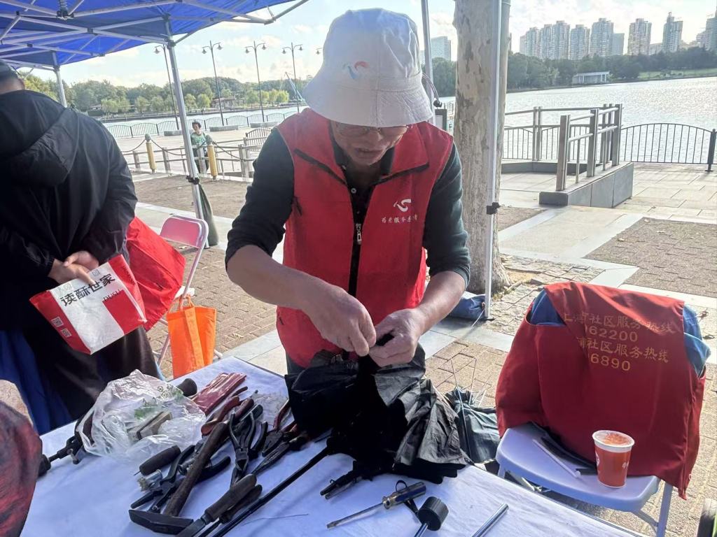 便民服务区为老人们提供了不少利好。李师傅在杨浦公园附近修伞已有四十多年,手艺过硬,此次被邀请来提供为老服务。摊位前,杨爷叔耐心等着前面排着队的4把伞,他在家时接到出门锻炼的老伴电话,喊他带着家里的2把坏伞出来,“我们平时都不舍得丢这种,修伞的地方现在也比较少了,有这种服务蛮好的,还免费。”