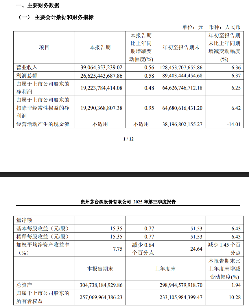 10月29日,贵州茅台酒股份有限公司(贵州茅台,600519.SH)披露2025年第三季度报告,公司前三季度实现营业总收入1309.04亿元,同比增长6.32%;营业收入为1284.54亿元,同比增长6.36%;归母净利润为646.27亿元,同比增长6.25%。