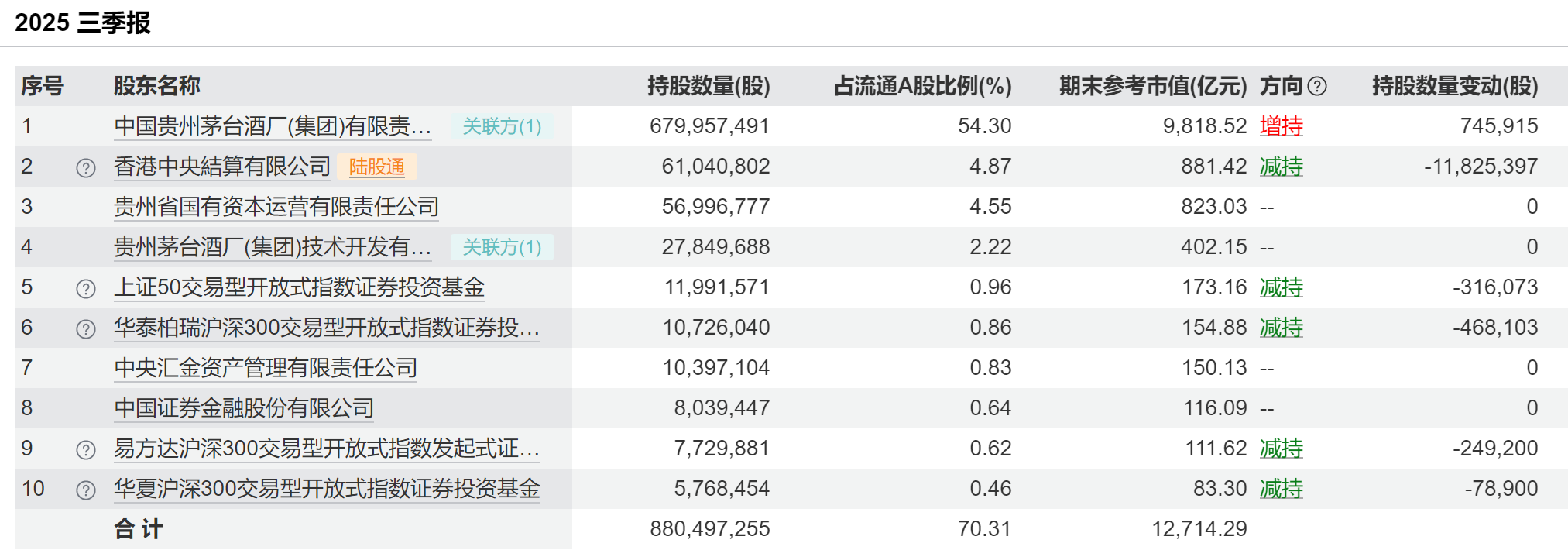 从前十大流通股东变化来看,据Wind数据,报告期内,1股东增持,5股东减持。其中,茅台集团增持7459.15万股,占流通A股比例增至54.30%。香港中央结算有限公司、华夏上证50ETF、华泰柏瑞沪深300ETF、易方达沪深300ETF、华夏沪深300ETF期内分别减持1182.54万股、31.61万股、46.81万股、24.92万股、7.89万股,占流通A股的比例依次降至4.87%、0.96%、0.86%、0.62%、0.46%。