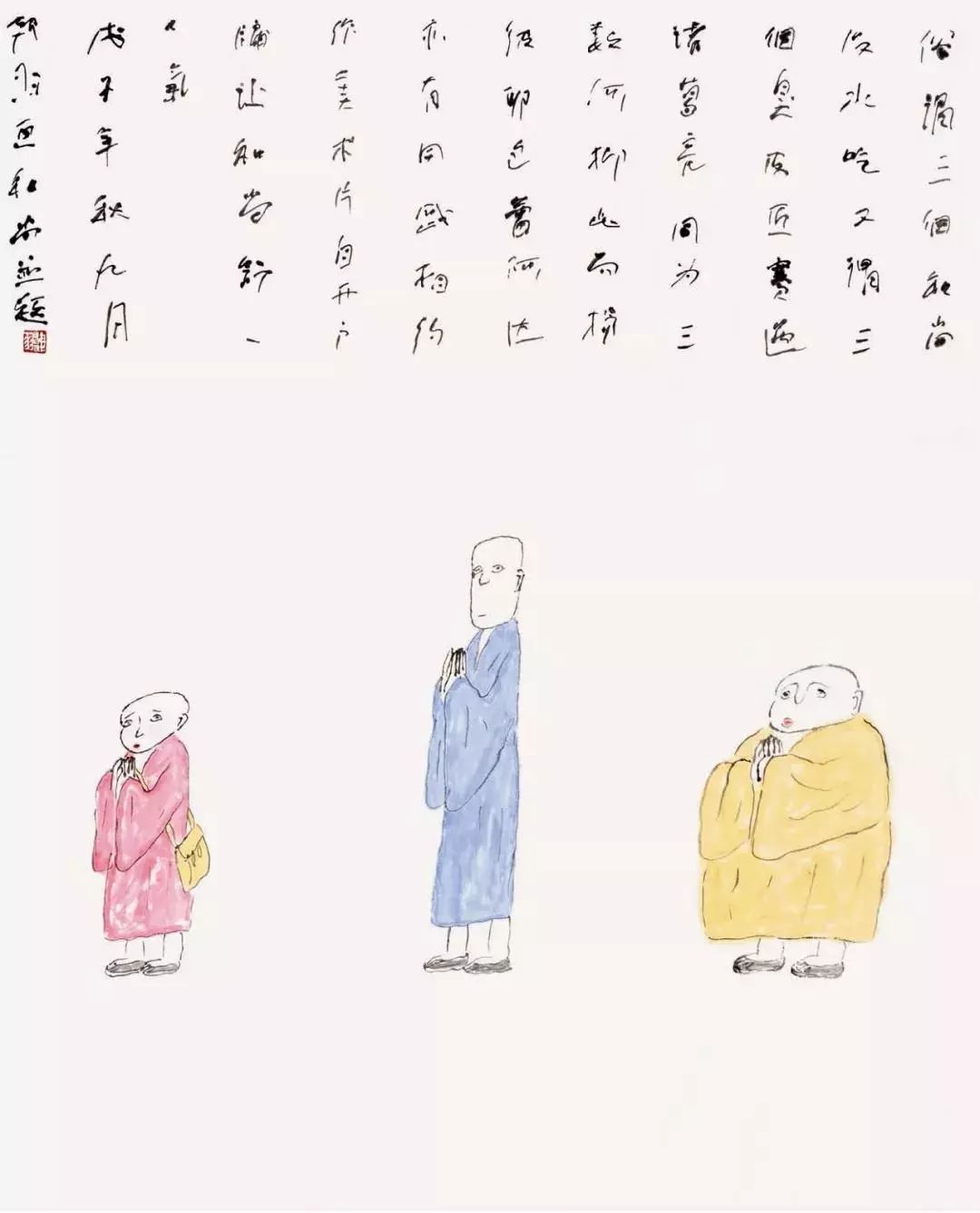 韩羽画作《三个和尚》,题曰:“俗谓‘三个和尚没水吃’,又谓‘三个臭皮匠,赛过诸葛亮’,同为三数,何抑此而扬彼耶?包蕾、阿达亦有同感,相约作美术片自开户牖,让和尚舒一口气。”