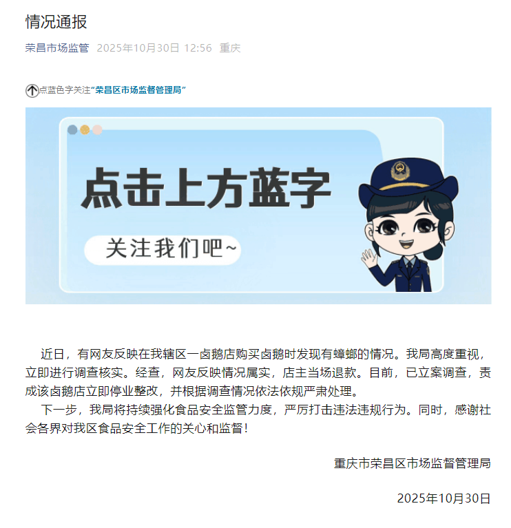 近日,有网友反映在我辖区一卤鹅店购买卤鹅时发现有蟑螂的情况。我局高度重视,立即进行调查核实。经查,网友反映情况属实,店主当场退款。目前,已立案调查,责成该卤鹅店立即停业整改,并根据调查情况依法依规严肃处理。