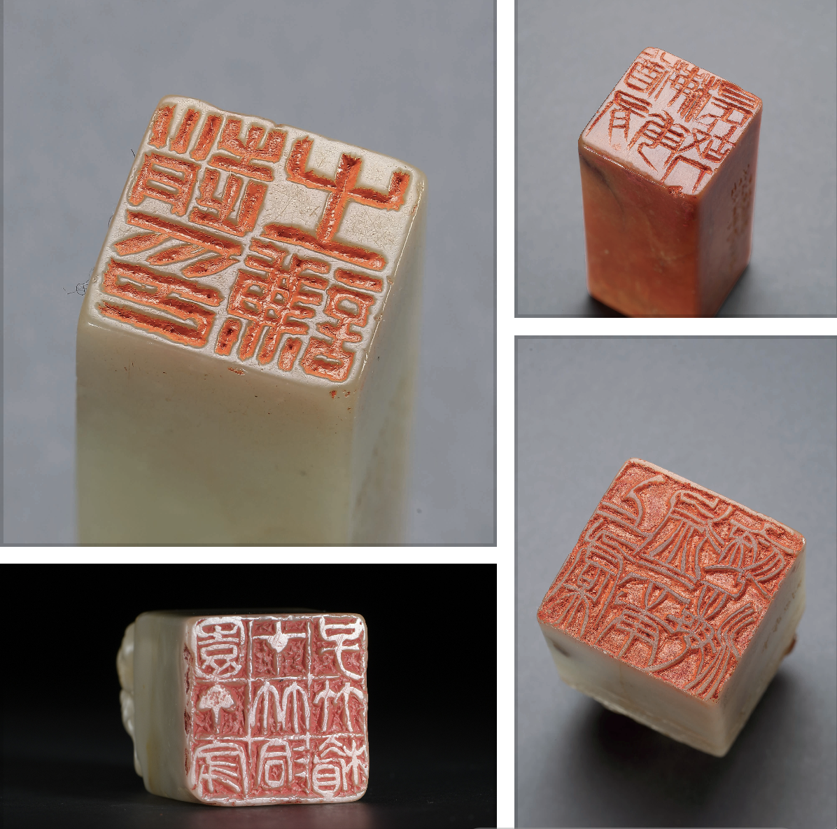 亮相嘉德秋拍的印章:左上,赵之谦刻 青田石自用印章;右上,齐白石刻 “犹有梅花是故人”寿山石印章;左下,吴昌硕刻 “园丁家在竹洞号竹楣”寿山芙蓉石双螭钮方章;右下,徐三庚刻 “上虞徐三庚褎海”寿山芙蓉石龙钮印章。