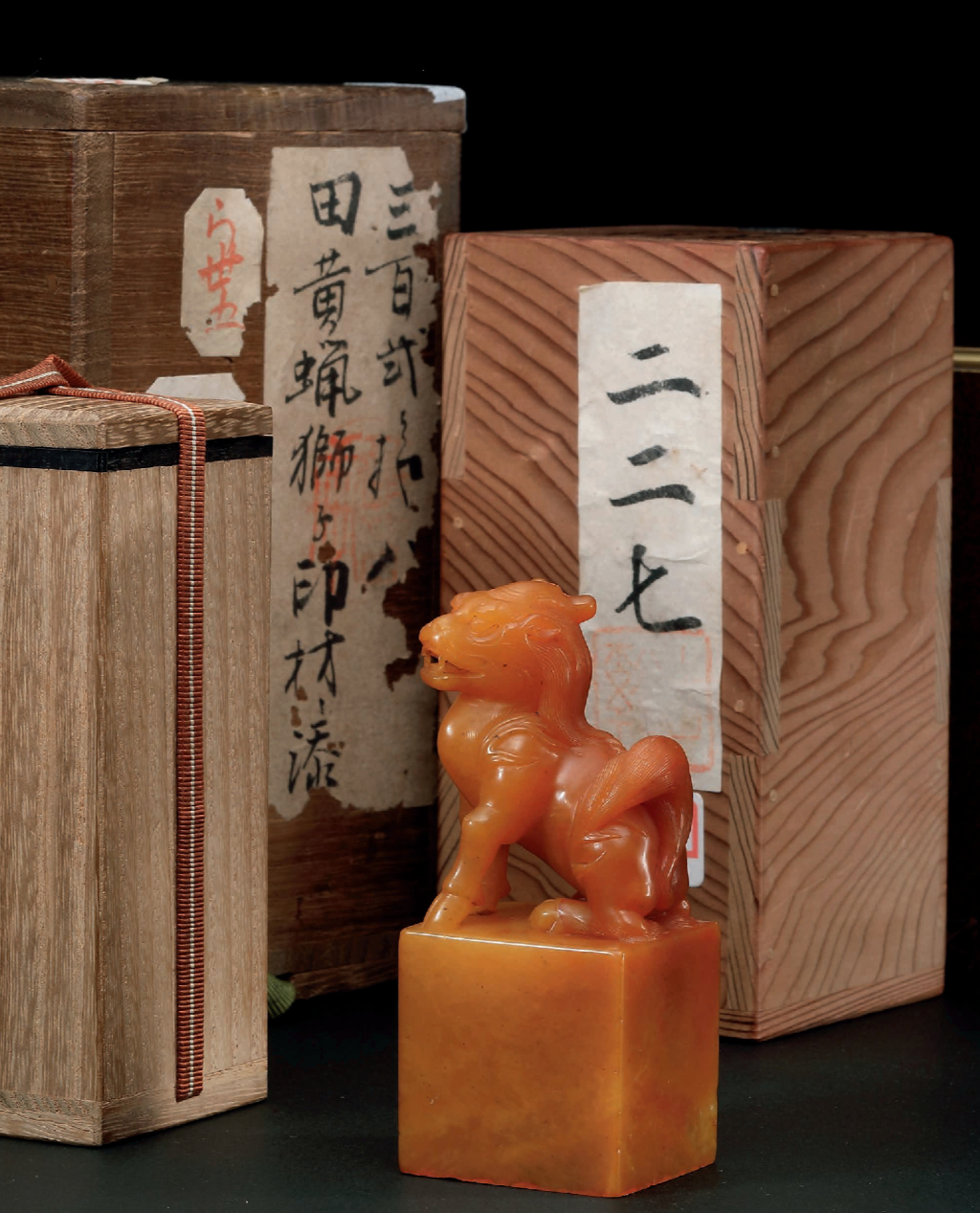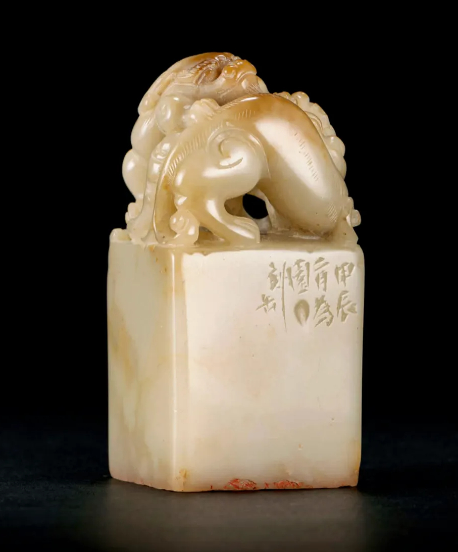 文人印石之美,不止于章法气象,亦在材质精纯与雕工妙思。明清以来,以石为印渐成主流,印石之材愈趋温润可琢。寿山石以其质地细腻、色泽丰润最为世所推崇,其中田黄尤为诸石之冠,纹理细腻、光晕若脂,被誉为“石中帝”;鸡血石色彩华烨,气象雍容,历为王公雅士所珍。