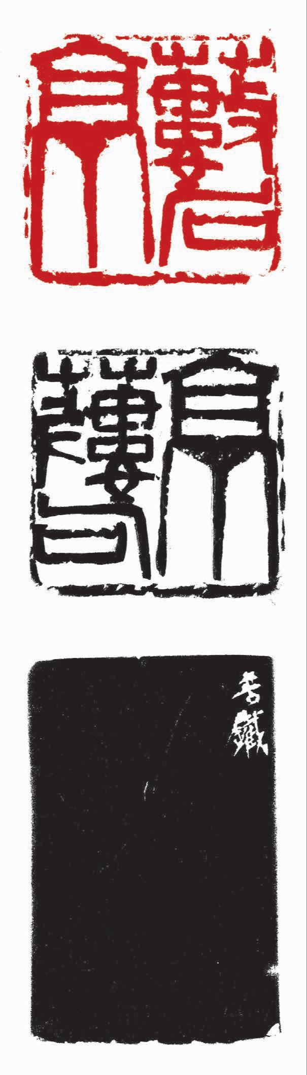 “薮石亭”为吴昌硕粗朱文印代表作,左、右、上均逼边,唯下部留空,有密不透风之感。“亭”字独行挺立,卓然高耸,尤以“亭”字下部一竖引笔直下,贯气如虹,似古藤垂露,劲挺而富有弹性,顿使全印精神振起。此印章法布局疏密得当,虚实相生,与浙江省博物馆所藏较小一方“薮石亭”大同小异,然气势更壮,两印如大珠小珠并美。