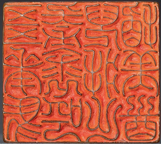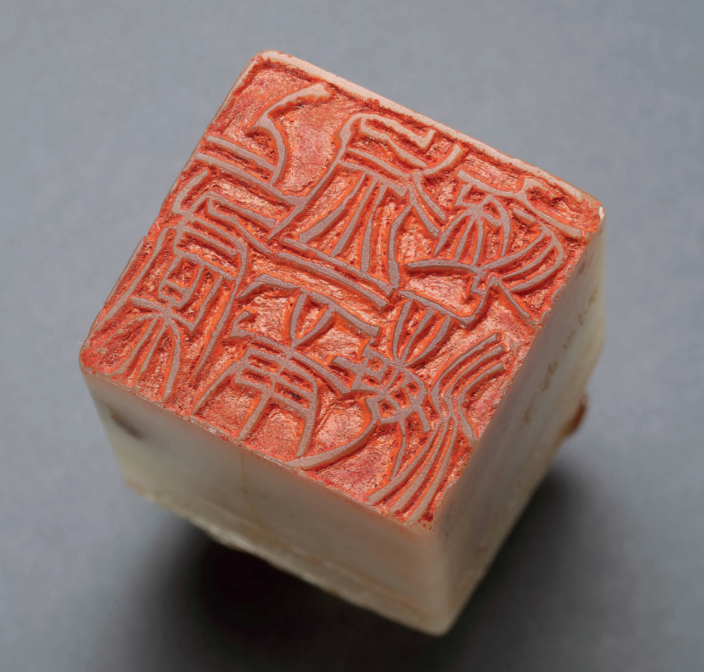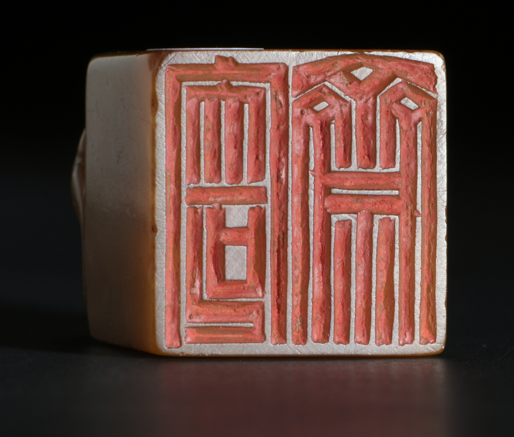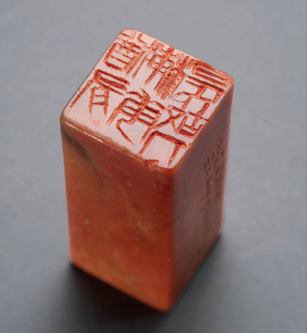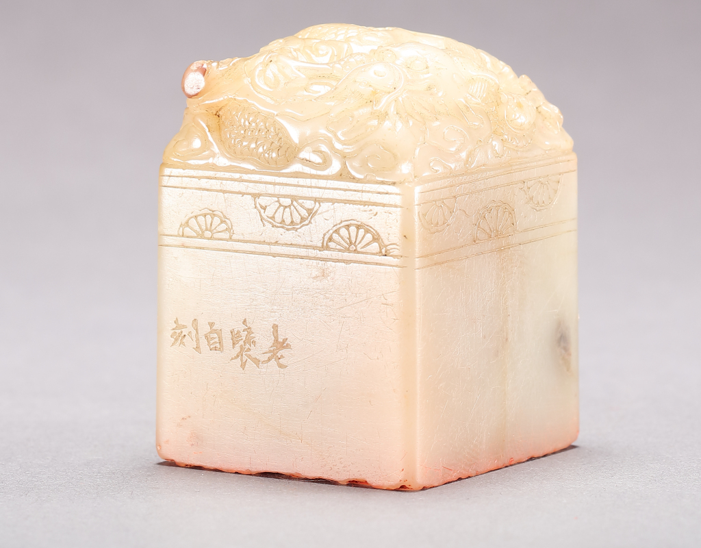 吴昌硕刻“园丁家在竹洞号竹楣”寿山芙蓉石双螭钮方章,其印面主人为朝鲜贵族闵永翊,吴昌硕一生为其治印上百方,可谓平生知己。此印作于光绪三十年(1904)吴氏六十一岁时,九字印文辅以界格布局,线条浑厚,可见用刀以不同角度敲击印面营造苍茫效果,是吴昌硕典型的仿封泥之作。此章所用印材形制周正大方,色泽柔美,雕工古朴。寿山芙蓉石是与田黄齐名的“石后”,其质温润凝腻,色泽有白、黄、红、五彩等多种形态,晚清开采增多,运用渐广,不少好石均产于此时,时人有“如西子不施脂粉,而意态淑真尤动人”的形容。