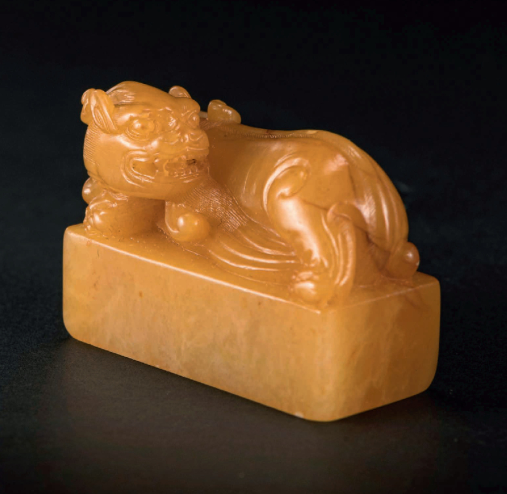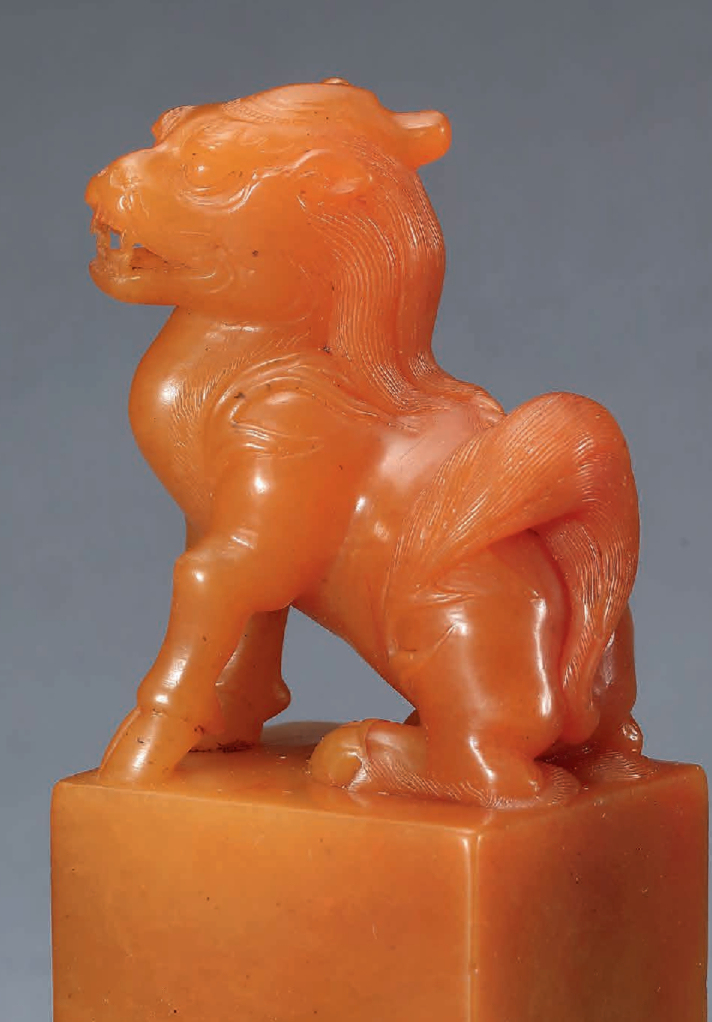 另外,清代寿山田黄石螭虎钮长方章,以及清中期寿山芙蓉石太狮少狮钮对章,色泽温润,造型古朴。
