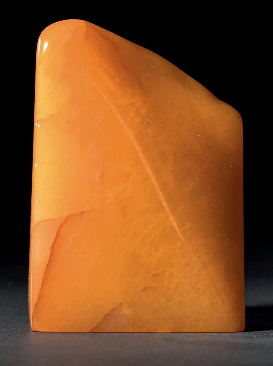 此枚清早期的田黄石自然顶长方章,重170克,色如蜜蜡,质地凝结,萝卜丝纹清晰可见,可谓材大质优,相当难得。