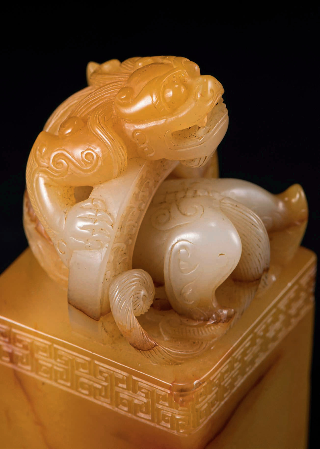 从雕琢工艺来讲,一枚清早期寿山田黄石环螭钮大方章展现了当时精湛的刀工。此枚大方章重180克,印身方整,质地洁净,通体黄中带红,色泽深沉浑厚;印钮雕一螭穿环而过,造型高古显受青铜器影响,有着清代田黄印中少见的庄重气息。