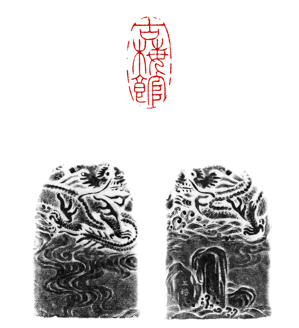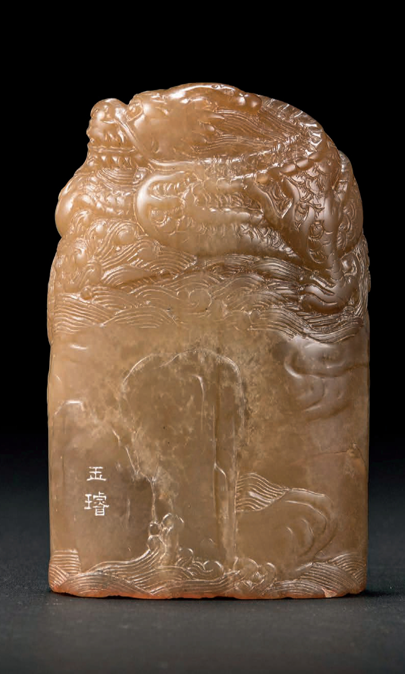 这枚“寿山石云龙钮椭圆章”就集中体现了杨玉璇全面的技艺。印章顶部的钮雕,是云中游龙戏水的生动场景;印章的侧面,则用浅浮雕(薄意)刻画出海水与巨石的纹样。整枚印章从上到下,画面连贯一体,显然是经过通盘考虑的布局。画面有密有疏,有放有收,确实是一件构思非常精妙的作品。