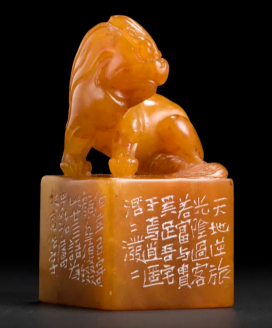 寿山田黄石瑞兽钮方章的印文文字出自李白的《将进酒》,“五花马,千金裘,呼儿将出换美酒”,豪放不羁。