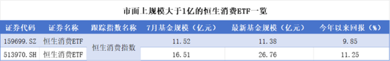 Choice数据显示,市面上大于1亿的恒生消费ETF共有两只,分别是恒生消费ETF(159699.SZ)和恒生消费ETF(513970.SH),今年以来回报分别为9.9%和11.3%,远远跑输科技赛道。