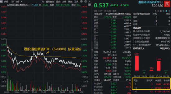 值得关注的是,资金已用脚投票。数据显示,截至10月29日,港股通创新药ETF(520880)近10日累计吸金超2亿元。今日行情不济,但场内放量溢价,或有资金继续逢跌吸筹。