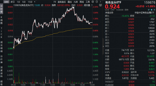 昨日场内价格暴拉4.58%的有色龙头ETF(159876),今日场内涨幅最高上探2.3%,收涨1.09%,全天成交额6873万元,环比小幅放量。