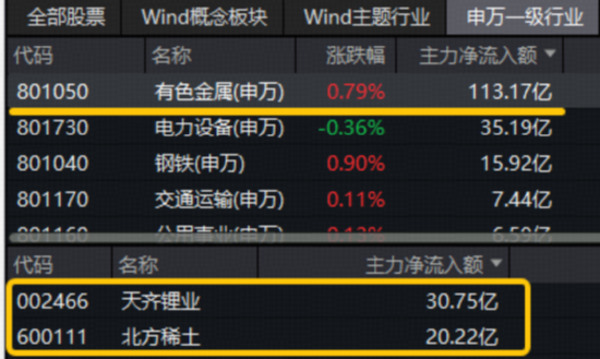 资金面上,有色金属板块获主力资金净流入113.17亿元,高居31个申万一级行业断层第一。权重股天齐锂业、分别吸金30.75亿元、20.22亿元,包揽A股吸金榜第一、第二位。