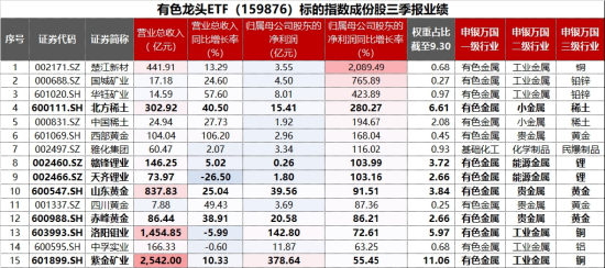 业绩层面上,有色金属板块业绩增长显著!截至10月29日,有色龙头ETF(159876)60只成份股中,已有53家上市公司披露三季报,其中49家实现盈利,39家归母净利同比正增长,其中,归母净利同比暴增20倍,、、北方稀土等8只个股实现归母净利三位数大增!