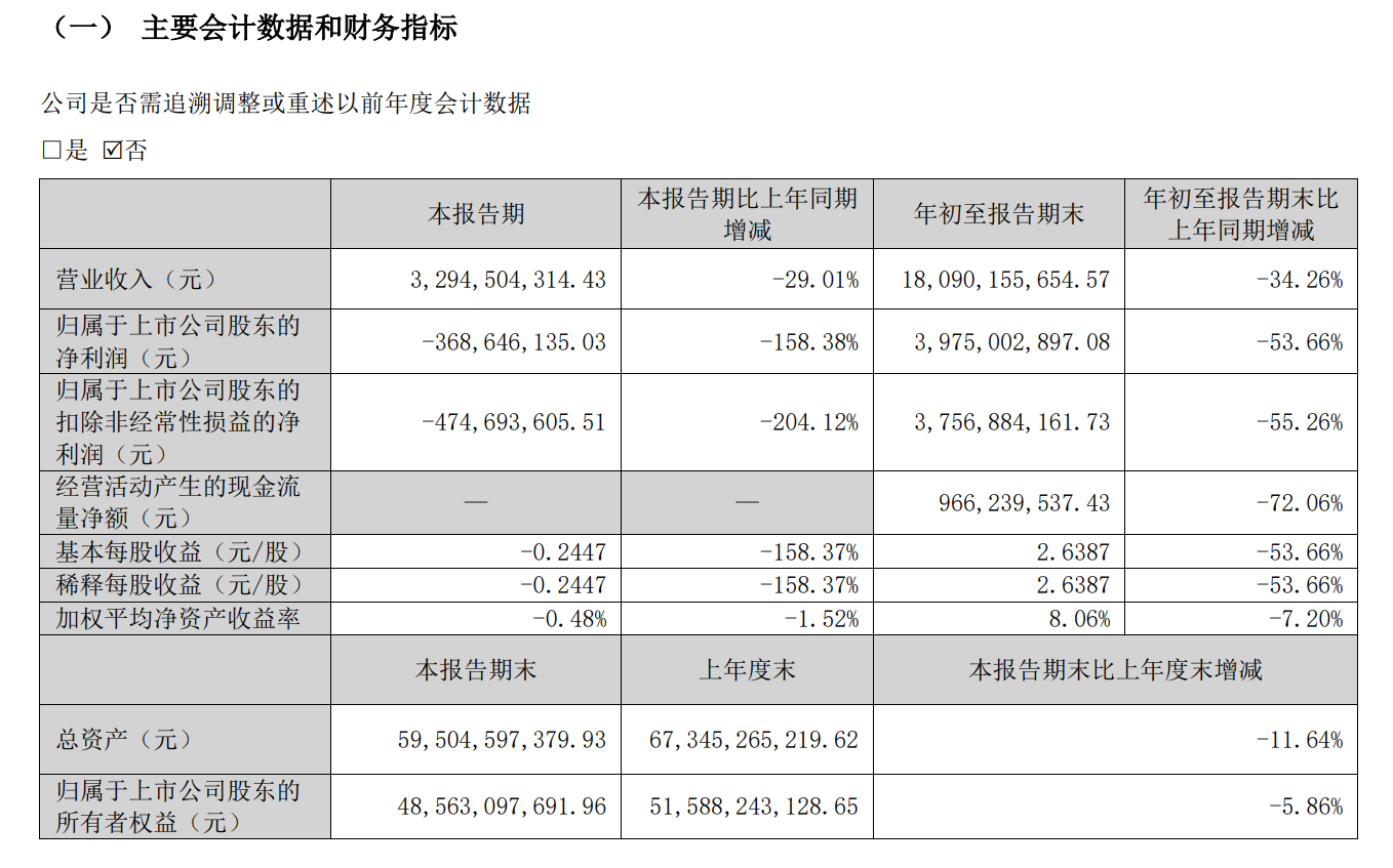其中,第三季度实现营业收入32.95亿元,同比下降29.01%;归母净利润亏损3.69亿元,同比转亏,上年同期净利润6.31亿元。