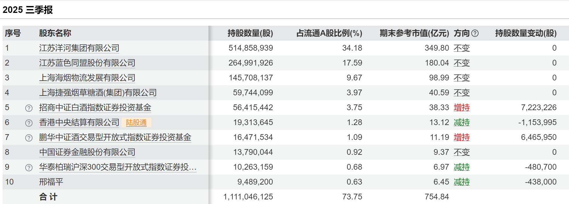 三季报显示,公司前三大股东分别为江苏洋河集团有限公司、江苏蓝色同盟股份有限公司、上海海烟物流发展有限公司,持股比例依次为34.18%、17.59%、9.67%。