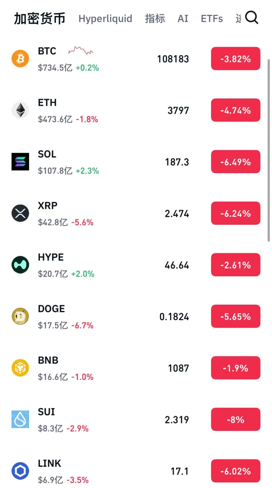 加密货币集体下跌