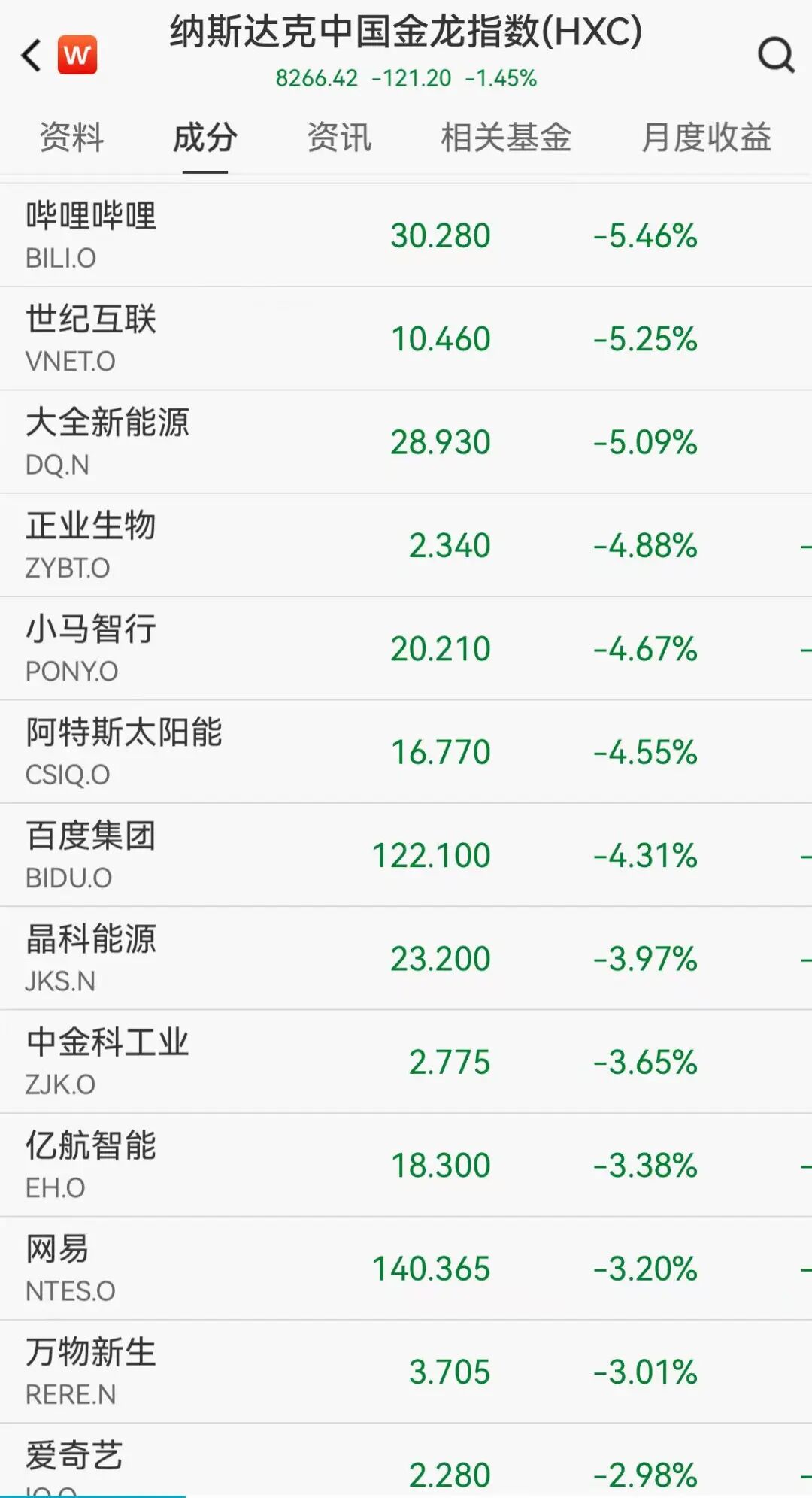 纳斯达克中国金龙指数走低,个股方面,B站跌超5%,百度集团跌超4%,网易跌超3%,爱奇艺跌近3%。