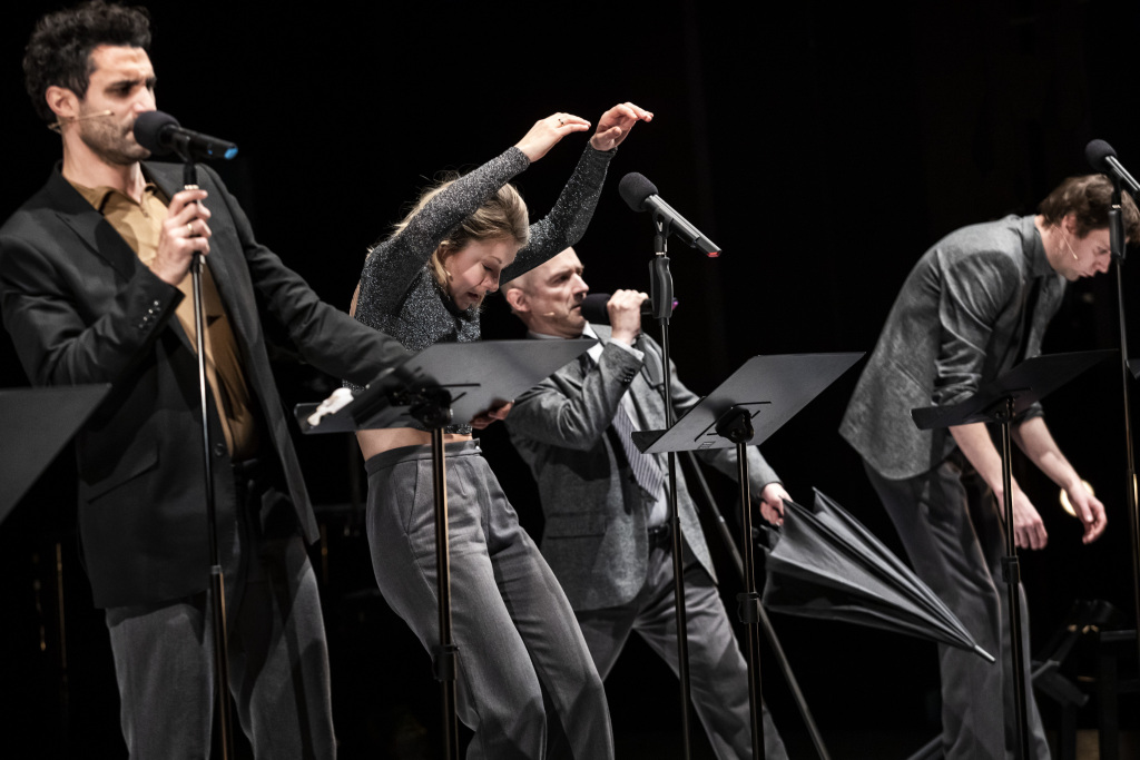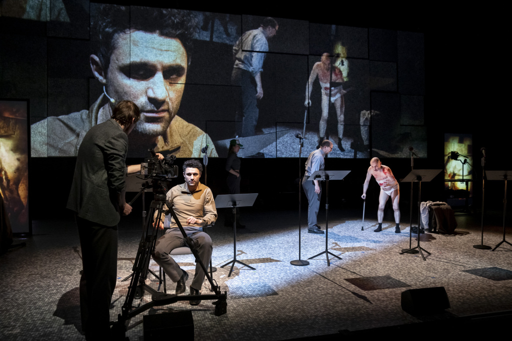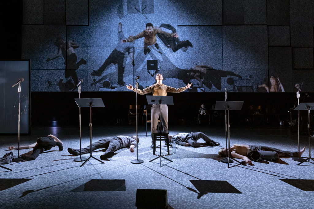 不同于传统改编,这一版本的《米歇尔科尔哈斯》彻底摒弃再现式布景与情节化叙述,采用了极简主义的演出形式:一个空旷的舞台,一排独立式麦克风,一张操作影像的工作台和几把椅子。演员们穿着统一的灰色西装,以极高的语速接力朗读小说原文段落,同时在不同身份之间高速切换,既唤起16世纪的叙事,又直指21世纪的政治现实。创作者以声音、身体、投影和摄像机共同建构出一个迷宫,将对正义与秩序的拷问延伸至当下现实,使作品在当代语境中焕发出新的思想锋芒。