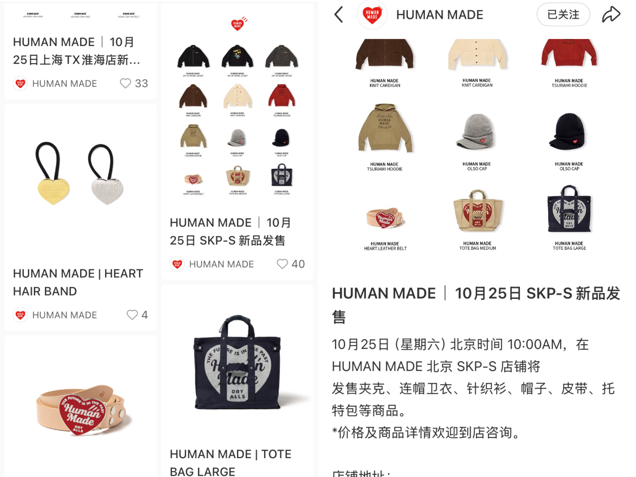 Human Made的做法是在官网和社交媒体账号上高频率更新内容,这些内容大部分是新品发售信息,甚至不需要堆砌文案和氛围感的模特图,就是简单明了地介绍发售的产品、时间和渠道,配上最基础的产品平铺图。
