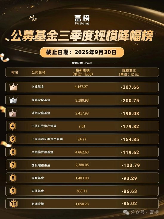 不过,熟悉富榜风格的投资者都清楚,在各大媒体竞相追捧头部公司亮眼业绩与规模时,富榜始终保持差异化视角,更关注那些在行业上行周期中规模逆势下跌的公司 —— 本期内容,我们就聚焦三季度规模下跌幅度最大的一批基金管理公司,剖析其规模缩水背后的关键原因。
