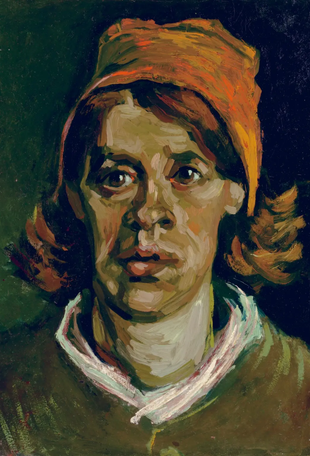 在画业的初期,梵高的目标是成为描绘农民的画家,并创作了大量的习作。这些作品最终汇聚成了他荷兰时期的代表作《吃土豆的人们》,展出的这幅《女子头像》也是其中之一。在这段时间里,梵高通过书本学习色彩理论,并在创作中尝试各种方法。在这幅作品中,补色的效果也被加以应用。由于色调较暗,可能不太容易察觉,但画面中的脸部和帽子呈现出红色调,与衣服等部位的绿色形成了鲜明的对比。