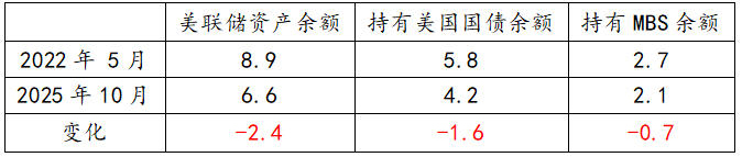 其次,美联储明确了资产负债表结构的平衡路径。美联储本轮量化紧缩始于2022年6月,当时美联储资产规模高达8.9万亿美元,占到同期美国GDP的34%,其中持有的美国国债有5.8万亿美元、MBS有2.7万亿美元,经过三年半的缩表,目前美联储资产规模降至6.6万亿美元,占同期美国GDP的比重也降至21%,持有美国国债与MBS规模分别为4.2万亿美元、2.1万亿美元。