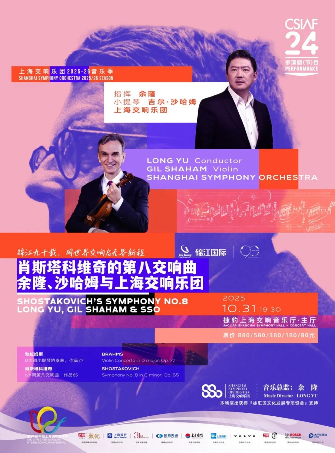 今天(10月31日),中国上海国际艺术节更有多场值得一看的演出在申城各处剧院精彩上演,比如10月31日晚,小提琴家沙哈姆将和余隆指挥的上海交响乐团,合作勃拉姆斯《D大调小提琴协奏曲》。返场时刻,他会特别加演《梁祝》选段,奏响如泣如诉的唯美旋律。当晚,乐团还将继续推进“肖斯塔科维奇交响曲全集录音”计划,献演《第八交响曲》。从上半场的莱茵晚霞,到下半场的战火硝烟,观众可以在一场音乐会中感受两种截然不同的风格碰撞。