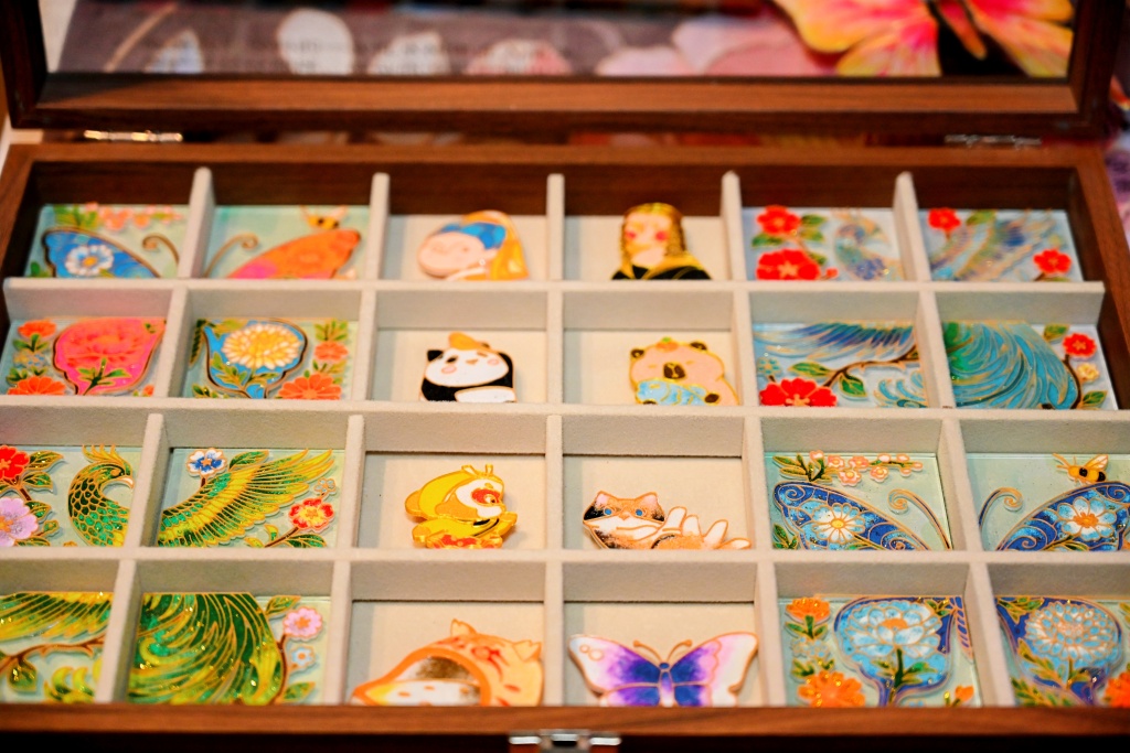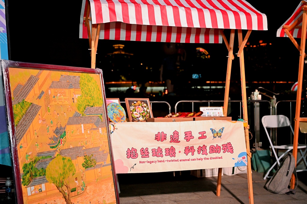 赛场旁的“苏河市集”同样人气十足,各类特色摊位为参赛者和观众提供了多元化的消费体验。市集汇聚了非遗文创、传统养生体验、健康产品试吃等特色摊位,并设有AED科普、运动健康咨询等互动摊位,集中展示着“运动+可持续”的消费新范式。其中,由“跃界文化”打造的非遗掐丝珐琅摊位,创新融合AI设计技术,吸引众多市民驻足体验。