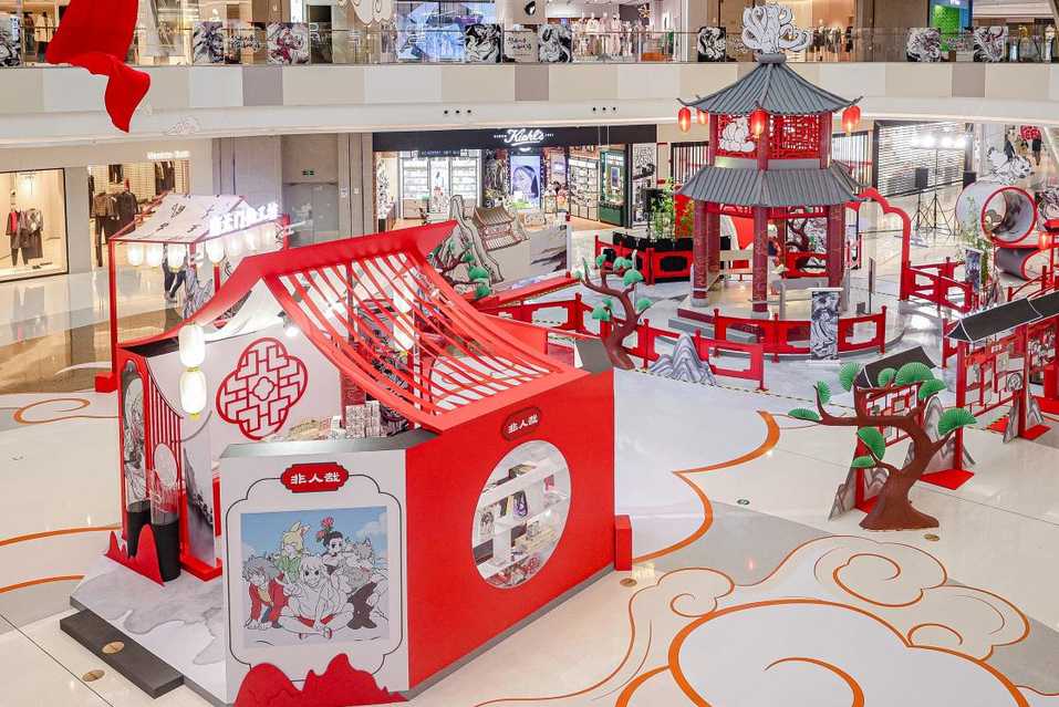 10 月15日至11月30日,七宝领展广场迎来九周年庆典,依托七宝古镇的千年文化积淀,项目带来非人哉全国首展,并将漫画中的神话场景转译为可游可逛的实体国风场景,打通了“娱乐-消费-情感”连接,也为商业体与文化IP融合模式探索出新道路。
