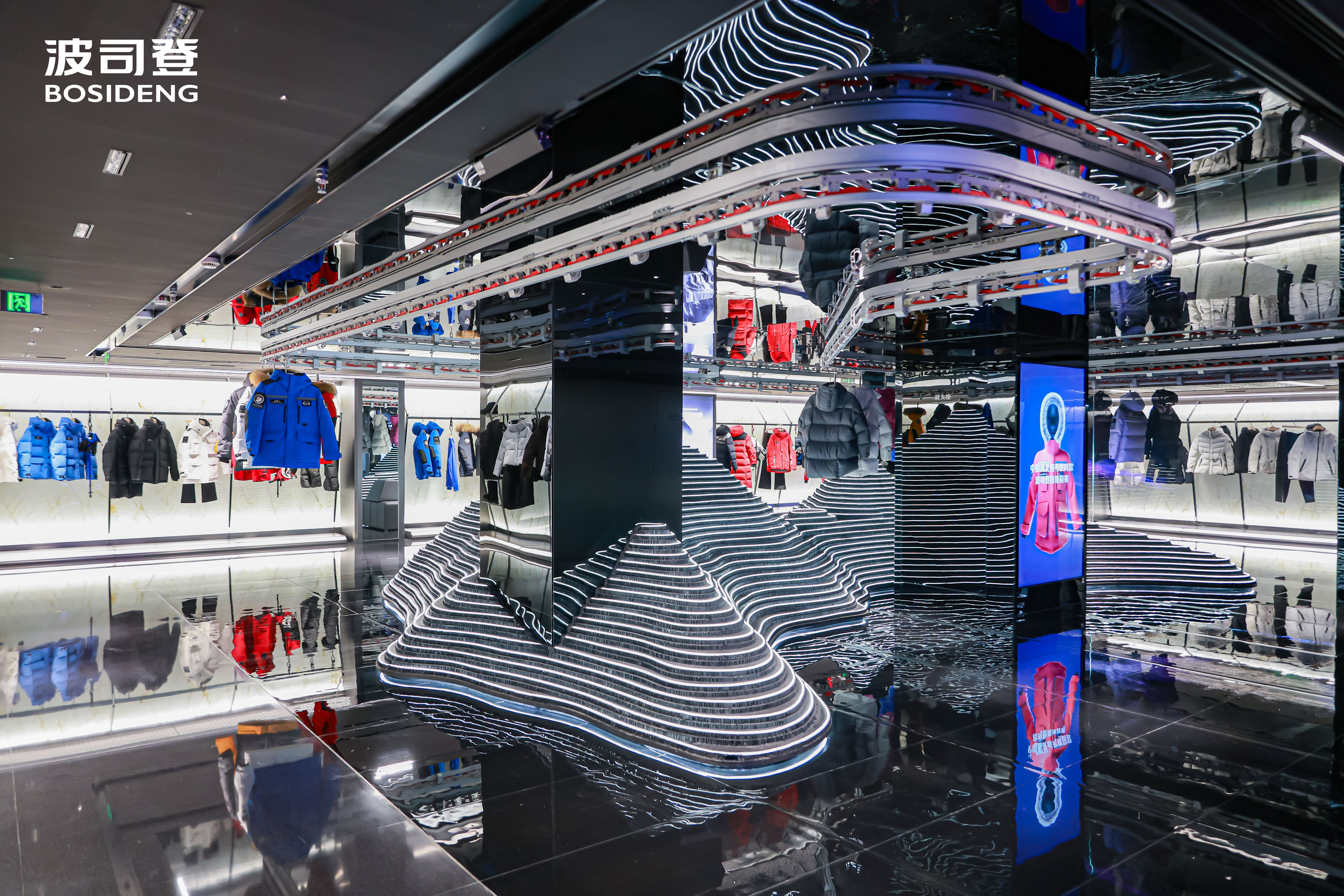 波司登将“珠峰”意象引入上海南京东路,外立面以层叠穿孔铝板勾勒珠峰轮廓,室内则以“征程起点—砥砺攀登—顶峰相见”为叙事主轴,打造三层递进的沉浸式攀登之旅:一层灵感源自珠峰大本营,以帐篷结构搭建核心体验区;二层以科技感诠释攀登历程,设有运动区、商务区、童装区和焕新工坊;三层的模拟衣拿系统环绕珠峰等高线展示秀款,结合透明屏互动,诠释“登顶,只是新起点”的探索精神。