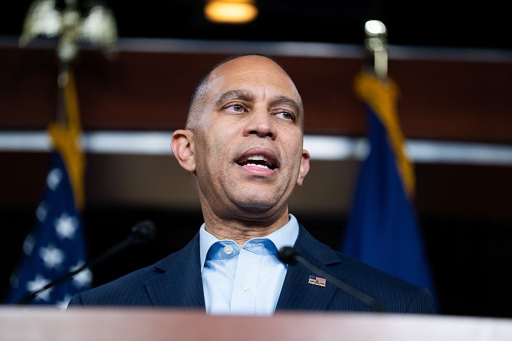 当地时间2025年10月30日,美国华盛顿,美国国会大厦,美国众议院少数党领袖哈基姆杰弗里斯接受媒体采访。美国政府停摆已进入第30天,成为美国历史上第二长的政府全面停摆事件。视觉中国 图